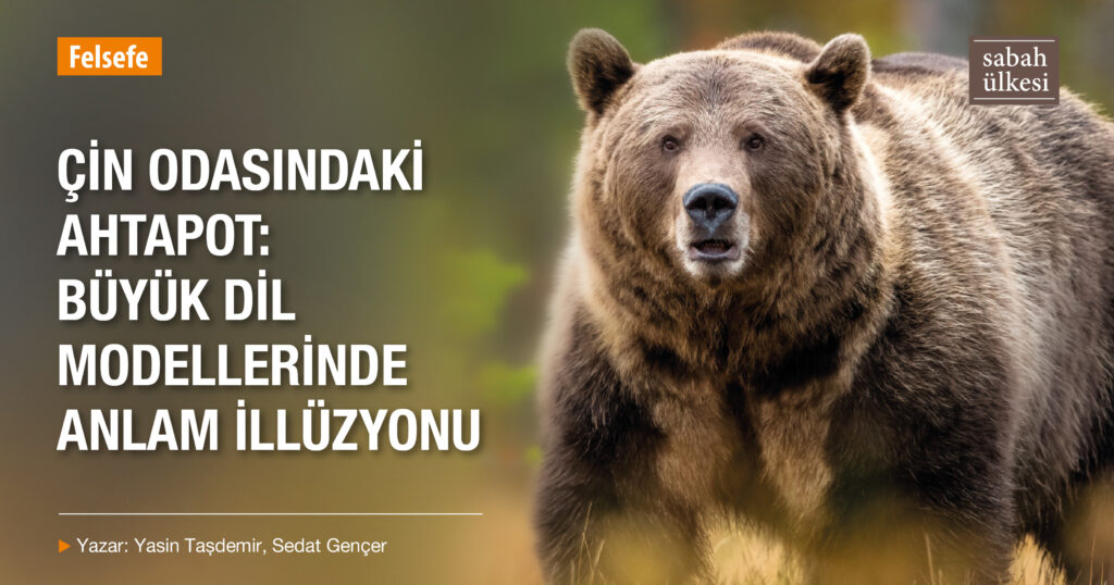 Büyü bu noktada bozulur. Ahtapot daha önce ayı sözcüğünü ve değnek sözcüklerinin istatistiksel örüntülerini bilse de gerçek dünyada bir ayının nasıl bir şey olduğunu, ayının ne kadar tehlikeli olduğunu ve bir değneğin fiziksel olarak nasıl kullanılacağını “bilemez”. Yani bu nesnelerin fiziksel dünyadaki karşılıklarından habersizdir. Bu sebeple ahtapot bu mesajın gerçekte “ne anlama geldiğini” bilmez ve genel geçer cevaplar verir. Böylece A kişisi durumun farkına varır ve karşısındaki kişinin gerçek bir insan olmadığını anlar (eğer ayıdan kurtulmayı başarırsa). Bu düşünce deneyi de bize sadece dildeki formlara, istatistiksel örüntülere dayanan, fakat dış dünyaya referansı olmayan sistemlerin gerçek bir anlam kavrayışına sahip olamayacağını gösterir. Karşı karşıya olduğumuz Büyük Dil Modelleri (LLM’ler) işte bu hikâyedeki ahtapottur. Bu Dil Modellerinin “büyüsüne kapılmış” A bireylerinin karşılarında gerçek bir insan olmadığını fark etmeleri için belki de bir “ayı ile karşılaşmaları” gerekiyordur. Asıl kritik soru ise şudur: Bizim hikâyemizde bu “ayı” ne olacak?